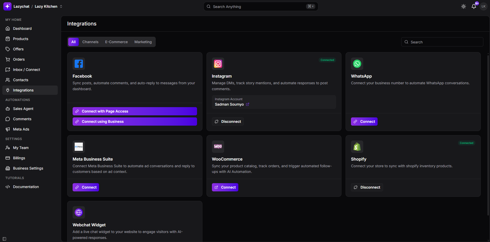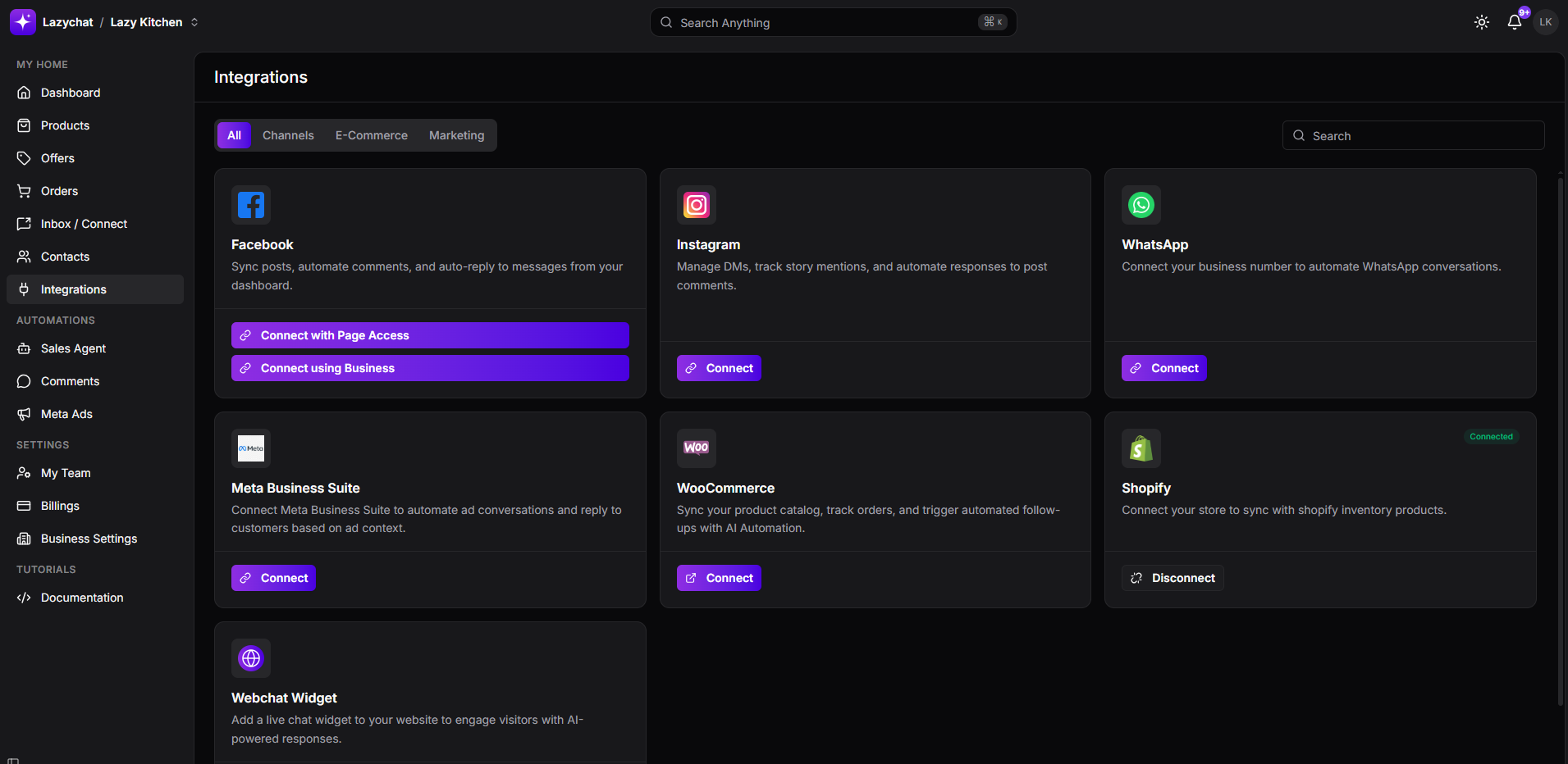 After authorization is completed, go back to the Integrations page in LazyChat.