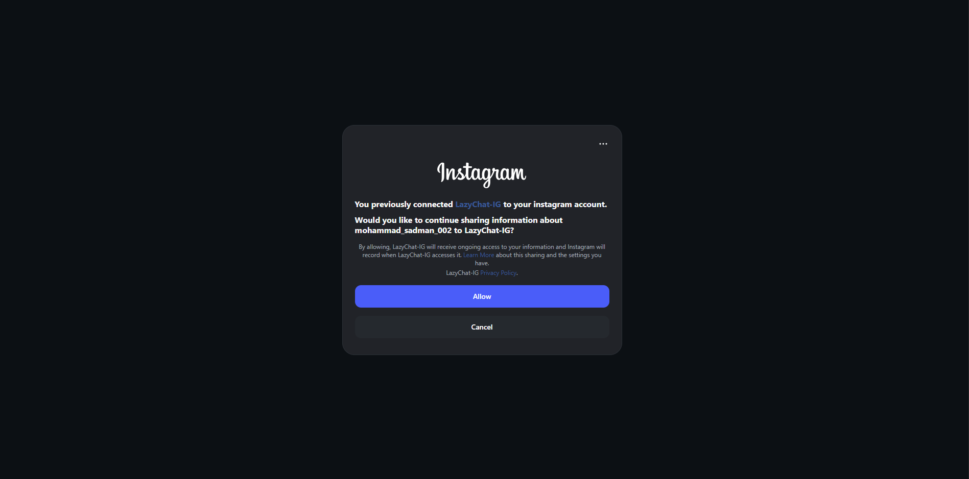 - Click Allow to continue sharing your Instagram account information with LazyChat.