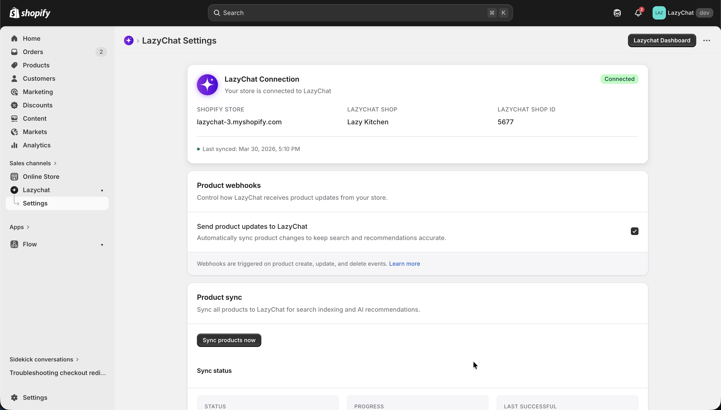 After the connection is completed, the LazyChat Settings page in Shopify will show: